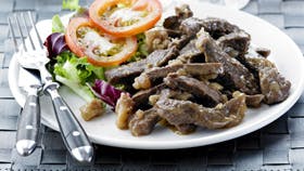 Skær kødet i skiver og dernæst i strimler på ca. 1 cm tykkelse. Drys med salt og peber og lad det stå med dette mindst 20 min. Rør bouillon med mel og bring i kog, så det jævner. Kom krydderier og halvdelen af cremefraichen i. Skær løget i skiver og brun så både kød og løg på en pande. Kom det i sovsen og lad det småsimre i ca. ½ time, til kødet er mørt. Røres med resten af cremefraichen. Server med råstegte kartofler.