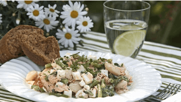 Vend ørred og feta i bønnesalaten og server med et stykke groft brød.