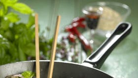 Sauce: Rens chilien og hak den fint. Rør ingredienserne sammen. Rens svampene og skær dem i mindre stykker. Pil løg og hvidløg og skær dem i skiver. Varm halvdelen af olien i wok eller en stor stegepande. Steg svampene 5-10 min. under omrøring. Krydr med salt og peber og læg dem på en tallerken. Steg løgene i resten af olien ca. 3 min. Tilsæt broccoli og steg 3 min. Læg løg og broccoli på en tallerken. Svits boghveden 2-3 min., til den er gennemvarm. Bland grønsagerne i og pynt med krydderurter. Server saucen til.