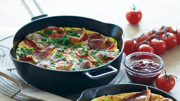 Pisk æg og mælk let sammen med salt og peber. Hæld æggeblandingen på panden. Løft jævnligt i æggemassen med en paletkniv, så det flydende kommer ned i bunden. Skær tomaterne i skiver og læg dem på æggekagen, når den er halvstivnet. Drys lidt salt og peber på. Pynt æggekagen med det sprøde flæsk og rigeligt, klippet purløg. Tag æggekagen fra varmen, inden det øverste lag æg er helt stivnet, så den ikke bliver for fast.