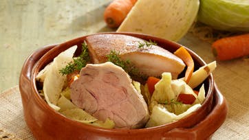 Skær kålen i kvarte eller ottendele. Pil løgene, skræl gulerødder, pastinak og persillerod og flæk dem. Læg grønsager, kød og bacon i en stor gryde. Tilsæt hvidvin eller bouillon samt timian. Læg de øvrige krydderier i en kaffefilterpose og luk den med snor. Kom posen i gryden sammen med salt. Lad det simre mørt under låg i 1 time. Skær bacon og kød i skiver og spis groft brød til.