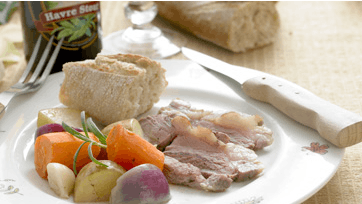 Skær et krydsmønster på skanken og brun den i smørret. Læg kødet i en bradepande og krydder med salt og peber. Vask kartoflerne, skræl gulerødder og løg og skær dem i mindre stykker. Læg rodfrugterne ned til kødet sammen med øl, vand og rosmarin. Dæk bradepanden til med stanniol og stil den i ovnen ved 170° i 1½ time til kødet er mørt. Server med groft brød og tzatziki.