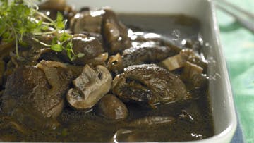 Dup kødet tørt og drys med salt og peber. Skær løg i skiver, udblød svampene i 6 dl vand. Brun kødet i olie ad nogle omgange. Brun så løget. Kom kødet i og drys med melet. Tilsæt øl, svampe og udblødningsvandet. Læg låg på og småkog i 2½ time. Du kan også komme det hele i en stegeso og stille i ovnen ved 160° i 2½ time. Tilsæt evt. mere væde undervejs. 30 min. før, kødet er fædigt, kommes halverede champignoner i. Server med brød og grøn salat og kraftig italiensk rødvin.