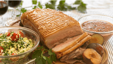 Brun begge sider af svinebrystet i en stor pande i en blanding af olie og smør. Sæt kødet i et ildfast fad i ovnen i 30 min. ved 180°. Hæld overskydende fedt fra. Hæld ½ l vand i bunden af fadet og sæt kødet tilbage med sværen op og laurbær og nelliker stukket i fedtet. Læg halverede, udstenede blommer ved. Læg alufolie over og stil i ovnen ved 160° i 1½ time. Blend til sidst blommer og braiseringslage og server til kødet med salaten. Salaten laves, ved at bulgur udblødes med kogende vand og spidskommen i 15 min. Blandes med smuldret feta, halverede tomater og krydderurter. Vendes med citronsaft, salt, peber og olivenolie.