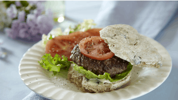 Form 4 bøffer og drys med salt og peber. Grillsteg dem på en pande ca. 8 min. på hver side. Flæk bollerne og smør lidt cremefraiche på underbollerne, læg salat, tomatskiver og bøf på og luk bollerne. Server med salat og evt. råstegte kartofler.