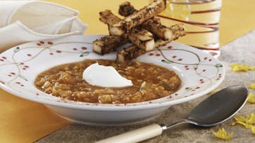 Skær courgetter og løg i små tern og svits dem let i olien. Tilsæt linser, tomatjuice og bouillon og lad suppen koge i ca. 20 min., til linserne er møre. Bland hvidløg, salt og olie sammen og pensl brødskiverne med blandingen. Skær brødene ud i stave og steg dem sprøde på en varm stegepande. Hak løvstikken, tilsæt den og lad suppen koge op. Smag suppen til med salt, peber og citronsaft og server suppen med brødstavene og syrnet fløde.