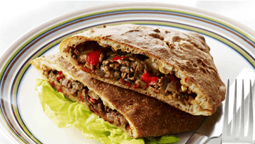 Fordel kødblandingen på halvdelen af dejen, fold sammen og "lim" dem sammen med lidt vand og pres ned med en gaffel rundt i kanten. Læg calzonen på en bageplade med bagepapir og bag den i ovnen ved 200°, til den er gylden.