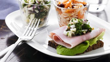 Anret salatblade på rugbrødet, læg skinken ovenpå og til sidst æblesalsaen. Server smørrebrødet med råkosten.
