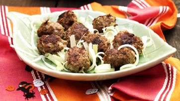 Rør kødet med salt, tilsæt rasp, mælk, æg, peber, sennep og timian og rør farsen godt igennem. Riv æblet på den grove side og bland det i farsen. Skær forårsløgene i 5 cm lange stykker, lav 3 snit på 4 cm i hver og læg dem i isvand. Form farsen til små kødboller og steg dem i smørret ved jævn varme, til de er gennemstegte. Anret kødbollerne på hver deres sæt "ben"/forårsløg.