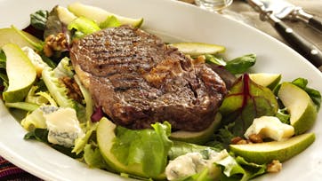 Skyl salaterne og vend dem i dressing af valnøddeolie, eddike, salt og peber sammen med pærer, ost og nødder. Steg bøffen drysset med salt og peber ca. 4-5 min. på hver side afhængigt af, hvor rød du vil have den. Server med salat og groft brød.