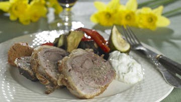 Begynd med at lave den kolde, røde pestosovs ved at blende det hele til en jævn masse. Sættes på køl. Lav farsen og farser lammet. Luk og steg ved 160° i 2½ time. Tjek, at centrumstemperaturen på farsen er over 70°. Lav straks efter, at stegen er kommet i ovnen, grønsagerne, der skrælles og skæres i store stykker og lægges i ovnen ved samme temperatur i 1½ time. Når stegen tages ud til sidst, kan grønsagerne evt. få 5 min. ved højere varme for lige at brune lidt. Tzatzikien røres også sammen og serveres til stegen sammen med den røde pestosovs.