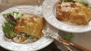 Kog fisken få min. i saltet vand. Gem vandet. Steg løg i smør og afbag med mel og kogevand samt fløde. Smag til med salt, peber og dild. Vend kogt fisk i sammen med rejer. Rul butterdejen ud en halv gang større og læg fisk med sovs på og pak ind. Luk med æg og bag ved 210° i 25 min. Server med salat.