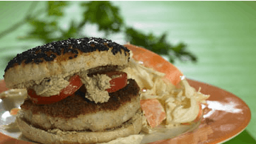 Rist og flæk bollerne og smør dem med grøn tapenade. Fyld bollerne med fiskeburger, tomatskiver og rucola. Server coleslaw til.