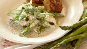 Frikadeller med asparges og blomkål i yoghurt