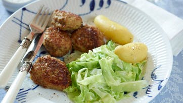 Rør en fars af hakket kød, løg, æg, gryn, mælk, salt og peber. Lad den sætte sig 30 min. i køleskabet. Steg frikadellerne i smør og olie ca. 10 min. alt afhængigt af tykkelse. Snit kålen i strimler og skær stokken fra. Kog den ganske kort i saltet vand og lad den dryppe helt af. Kog fløden ind til det halve og kom kålen i. Vend rundt og smag til med salt, peber og revet muskatnød. Server med pillede kartofler.
