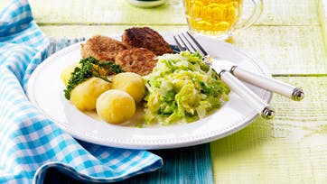 Rør en fars af hakket kød, løg, æg, gryn, mælk, salt og peber. Lad den sætte sig 30 min. i køleskabet og lav imens sovs og kog kartofler. Steg frikadellerne i smør og olie ca. 10 min. alt afhængigt af tykkelse.