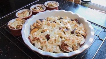 Tænd ovnen på 200°. Skyl frugterne, fjern kernehus og sten og skær frugterne i både. Læg dem i et smurt tærtefad. Smelt smør ved svag varme i en lille gryde. Tilsæt sukker og rør rundt. Herefter tilsæt mel og fløde og lad det koge op under omrøring. Hæld mandelflagerne i. Hæld blandingen ud over frugterne. Sæt fadet i ovnen og bag i ca. 10-15 minutter, indtil overfladen er gylden.