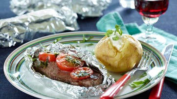 Læg pakkerne i køleskab ca. 4 timer før spisetid. Læg dem dernæst på en bageplade og sæt den i ovnen ved 225° 20-25 min. afhængig af tykkelsen og hvor røde, de må være. Server bøfferne med bagte kartofler, mager cremefraiche og persille.
