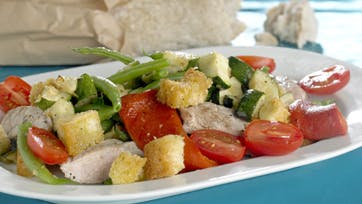 Vend tern af courgetter i olie, salt og peber. Bag dem i ovnen ved 225° i 15 min., til de har farve. Kom så brød i tern vendt i olie ved og skru ned til 200° og lad det hele få 10 min. til. Kog bønnerne i saltet vand i 5 min. Steg peberfrugt og skinke på grillpande nogle min. og vend det hele sammen til denne lune salat med brød og courgetter. Anrettes med tomater, salat og dressing.