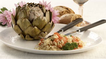 Vask artiskokkerne, og fjern stokken og de yderste blade. Åbn blomsten og fjern hårene i midten. Dryp artiskokkerne med lidt citronsaft for at undgå, at de bliver sorte. Bland kødet med æg og mel, og tilsæt hvidløg og løg, salt, peber og persille. Rør farsen sammen, og fyld den i artiskokkerne. Svits artiskokkerne let i olien, uden at de tager farve. Tilsæt løg, timian, hvidvin og vand, og lad det simre under låg i 35 min. Server med kogt bulgur blandet med olivenolie, citronsaft, persille og tomattern.