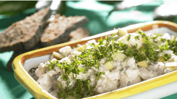 Del fisken i mindre stykker. Skær agurk og æble i små tern. Bland mayonnaise og cremefraiche og smag til med sennep, agurkevæde, salt og peber. Vend fisk, agurker og æble i. Lad salaten trække en times tid i køleskab. Server med rugbrød. Pynt med karse.