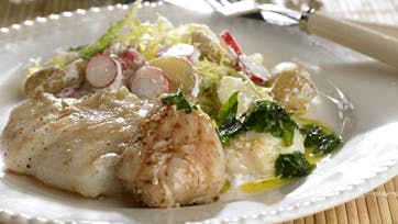 Pensl havtasken med olie rørt med salt, peber og paprika. Blend ramsløgene med olie og smag til med salt peber og citronsaft. Kog kartoflerne og afkøl dem . Vend skiver af dem med skivede radiser, rygeost og cremefraiche samt salaten. Grill fisken i tæt afstand til gløderne ca 2-3 min. på hver side. Server straks med ramsløgsolie og kartoffelsalat.