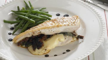 Lav lommer i kyllingestykkerne. Hak tomaterne og bland med basilikum og lav stænger af osten. Det hele stoppes ind i kyllingelommerne. Stykkerne steges over grill eller på grillpande ca. 15 min i alt og serveres med striber af glace og kogte, grønne bønner.