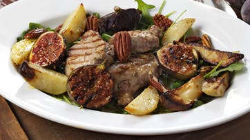 (4 pers.)40 min.800 g kartofleri små bådeSalt, peber og rosmarin1 spsk. olie4 skinkemignoner (af mørbraden)6 friske figner150 g rucola50 g