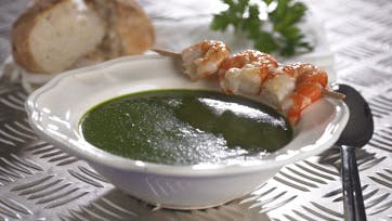 Rist rejerne 1-2 min. på grillpande og giv dem salt og peber. Varm suppen op og server med flute.