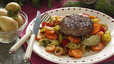 Steg bøfferne på grillpande ca. 8 min. på hver side drysset med salt og peber. Lad dem stå på eftervarme lidt. Rens og snit så løg, hvidløg, gulerødder og fennikel. Varm olien og steg grønsager ved middelvarme i 5 min. Tilsæt krydderierne og mere olie og småkog det hele i yderligere 5 min. Tag af varmen og kom tomater i halve og balsamico ved og giv et opkog, før der slukkes, og grofthakket persille, salt og peber kommes ved. Server bøffen med kogte kartofler til.
