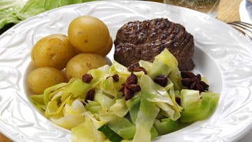 Kog kartoflerne i letsaltet vand. Form bøfferne og steg dem på grillpande ca. 8-10 min. på hver side. Snit kålen fint og damp den i lidt vand i 5 min. Hæld vandet fra og kom vin, allehånde, anis og rosiner ved . Lad det småkoge under låg i 6 min. Tilsæt eddike og smør. Lad det lune 2 min. Server til bøffen og vend kartoflerne i separat skål i pestoen.