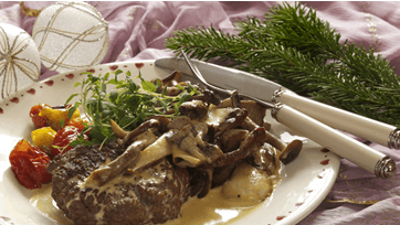 Form 4 bøffer og drys med salt og peber. Rens svampene og hak de største af dem. Bland med hakket skalotteløg og steg på pande i smør med jævnlige vendninger. Drys med timian og kog af med fløde. Kan evt. jævnes med 1 tsk. majsstivelse udrørt i koldt vand. Bland de oliemarinerede soltørrede og de ovnbagte tomater med lidt olie, salt, peber og grønne oliven. Server med groft brød.