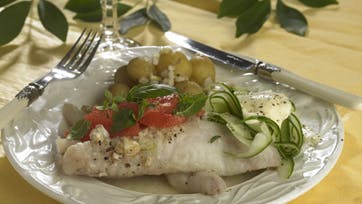 Læg fisken i 4 portionsstykker i et smurt ovnfast fad. Kog kartoflerne i saltet vand. Skær agurker i flager med en skræller og vend med salt, peber og cremefraiche. Sæt til side. Skær grape i fileter. Drys skalotteløg over fisken med salt og peber og hæld vin ved. Kom små klatter smør over. Sæt i ovnen ved 225° i 6-8 min. Anret på varme tallerkner med kogelage, agurkesalaten og de røde grapefileter, der drysses med krydderurter som basilikum, purløg og persille. Giv kogte kartofler til.
