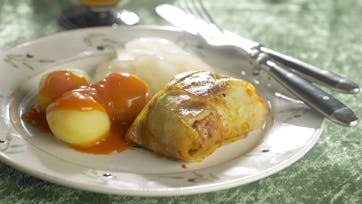 Rør en fars af hakkekød, salt, peber, æg, finthakket løg, mel og mælk. Blancher kålbladene i 3-4 min. Skær den grove stok fra og fordel farsen på bladene. Pak kålen sammen om farsen og bind dem med kødsnor. Læg kålrouletterne i en gryde, hæld bouillon og tomatpure over og lad det koge op. Læg låg på gryden og lad rouletterne simre ved svag varme i 30 min. Tag rouletterne op og brun dem på alle sider på en pande i olien. Kog sovsen op, jævn med majsstivelse og server med kogte kartofler og surt.