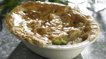 Skær kyllingen i passende små stykker. Steg det i olie sammen med løget og kom suppen ved. Kom boccollibuketter i suppen og smelt osten deri. Lad det koge i 2 min. Rul dejen ud på melet bord og saml stykkerne til et låg, der kan dække fadet. Kom kød med grønt og suppe i et dybt ovnfast fad og læg låg på. Pensl med æg og lav små huller i dejen. Bages ved 170° i 35-40 min. Server med grøn salat.
