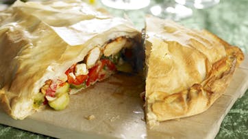 Halver rosenkålene og blancher dem i letsaltet vand. Skær peberfrugten i strimler og hak chilien fint. Bland rosenkål, peberfrugt, chili og smuldret feta. Svits kyllingefileterne i olien sammen med paprika, salt og peber i et par min. Læg alle fillodejpladerne på en bageplade med bagepapir og fordel grønsagsblandingen på den ene halvdel. Læg kyllingefileter og osteskiver over grønsagsblandingen og fold den tomme halvdel henover. Pensl med olie, klem kanten sammen og bag den ved 200° i 20 min. Server med råkost.