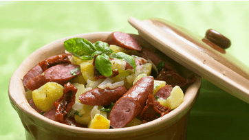Pil løg og hvidløg og skær dem i skiver. Svits dem 3-4 min. i smør og sennep i en gryde ved svag varme. Skær pølserne i grove stykker, kartofler i skiver og tomaterne i strimler. Læg pølser, kartofler og halvdelen af tomaterne i gryden og hæld bouillon ved. Kog det 2-3 min. uden låg. Drys resten af tomaterne og basilikum over retten og server med pesto.