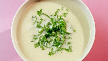 Pisk æggeblommerne med en lille smule suppe, inden de tilsættes den store portion - og suppen må ikke koge herefter. Smag til med salt, peber og sherry.