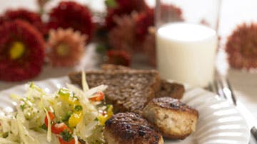 Mos kartoflerne og rør dem sammen med kødet. Tilsæt kapers, løg, salt og peber og rør farsen jævn. Form farsen til frikadeller og steg dem i lidt olie. Snit hvidkål og peberfrugter papirtyndt og bland det med forårsløg skåret i ringe. Pisk olie, eddike, salt, peber og presset hvidløg sammen til en marinade og hæld den over salaten. Vend persillen i salaten og server med et stykke godt brød.