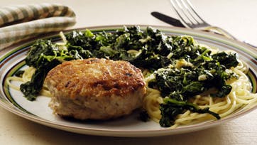 Til karbonaderne blandes kødet med mel, hvidløg, soja, chili, salt og peber og formes til 4 store karbonader. Steg dem på pande i olie 4-5 min. på hver side ved jævn varme.