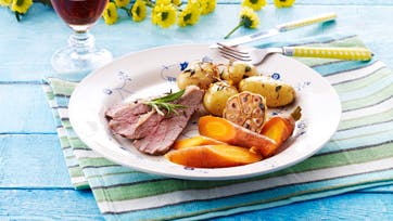 Server din kalvecuvette i skiver sammen med gulerødder og kartofler.