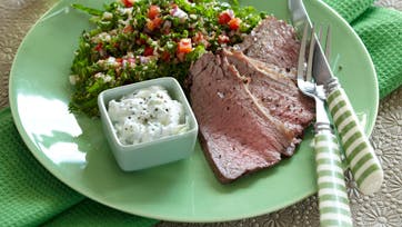 Læg cuvetten i et ovnfast fad og gnid den med saltet. Stik hvidløgsskiverne ned i lommer i kødet og steg cuvetten i 40 min. ved 200°. Kom bulgur og salt i en skål, hæld 1 dl kogende vand over og lad det stå i 10 min. Hæld evt. overskydende vand fra. Rør limesaft med olie, peber og persille og hæld det over bulguren. Skær rødløg og peberfrugt i tern og hak grønkålen fint. Bland bulguren med med løg, peber og grønkål, skær stegen i tynde skiver og servér med tzatziki.