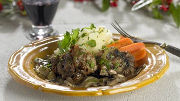 Brun kalvehalerne i en stegegryde i smørret og drys dem med salt og peber. Pil skalotteløgene og kom dem hele i gryden. Skær bladsellerien i strimler og tilsæt dem sammen med timian, hvidløg og hvidvin. Simrer ved svag varme under låg 2-21/2 time, til kødet næsten falder fra benene. Rens svampene, skær dem i skiver og kog dem med de sidste 5-10 min. Smag skyen til med salt og peber. Skyen kan jævnes med 2-3 tsk. majsstivelse rørt ud i lidt koldt vand.
