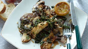 Steg bacon eller panchetta på en stor pande, til det er sprødt. Lad det dryppe af på fedtsugende papir. Hæld fedtet af panden, men vask den ikke. Kom smør og olie på panden. Drys leverskiverne med salt og peber. Brun skiverne ved meget høj varme 30 sek. på hver side. Rens svampene, skær dem i skiver og steg dem på panden. Kom timian- og salvieblade ved. Pil og hak løget, kom det ved og kog panden af med citronsaft og revet skal. Anret leveren med svampekrydderblandingen og den sprøde bacon. Servér retten med citronbåde, flutes og tomatsalat.