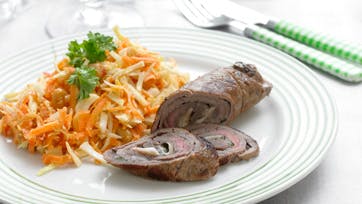 Bank snitslerne godt ud og læg persille, hvidløgsskiver og 1 spsk. pecorino på. Krydr med salt og peber og rul kødet sammen, hæft med en tandstik. Steg rullerne ved middelhøj varme på alle sider, til de virker faste og spændstige. Kom limesaft i en morter sammen med chili, halvdelen af nødderne, honning og oystersauce og knus blandingen til en fin pasta. Snit hvidkålen fint og riv gulerødderne. Bland dem med resten af nødderne og hæld pastaen over. Server med et stykke groft brød.