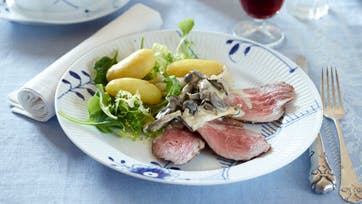 Gnid kødet med salt, peber, lidt revet citronskal og olie. Steg den 20 min. i ovn ved 200°. Lad den hvile lidt. Steg den ca. 10-15 min. mere, til et stegetermometer viser 52° for rosa steg. Lad den evt. hvile i staniol. Svits løg i smør, tilsæt svampe og kom vin og fond ved, når de begynder at brune, kog ind til det halve. Jævn med fløde og smag til med portvin, salt og peber. Serveres med blancheret, dampet eller rå spinat og stegte små stykker skorzonerrod samt kartofler til.