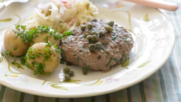 Snit kålen fint, bland den med saltet og lad den trække i 30 min. Rør kødet med kapers og persille og form det til bøffer. Steg bøfferne i smørret ved middelhøj varme i 6 min. på hver side. Skyl kålen, lad den dryppe af og riv pærerne på den grove side af et rivejern.