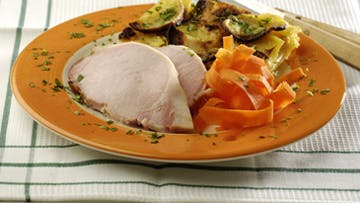 Pak hamburgerryggen i alufolie og bag den på plade i ovnen ca. ¾ time ved 200°, et kødtermometer skal vise ca. 60°. Skræl kartofler og selleri og skær det i tynde skiver. Bland det med salt i et smurt ovnfast fad. Bland mælk, fløde og sennepspulver og hæld det over. Læg et par smørklatter ved til sidst. Sæt fadet nederst i ovnen ved siden af hamburgerryggen ca. 45 min. ved 200°, til kartoflerne er møre.
