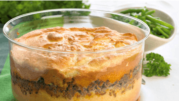 Skræl kartoflerne, skær dem i mindre stykker og kog dem i 20 min. Hak løg og hvidløg og sauter dem i olien. Tilsæt kødet og brun det af. Rør tomatpuré og krydderier i og smag til. Hæld vandet fra kartoflerne, mos dem med smørret og rør æggeblommer og krydderier i. Pisk hviderne stive og vend dem i mosen. Kom halvdelen af mosen i bunden af 4 smurte, ovnfaste portionsskåle og fordel kødet over. Kom resten af mosen over kødet og bag gratinerne ved 200° i 35 min. Server med grønne bønner dampede i lidt smør sammen med et fed presset hvidløg.