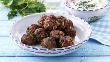 Rør kødet med citronskal, hvidløg, nødder, persille og tomatsovs. Smag til med salt og peber. Form boller, der dryppes med olie og steges i ovnen ved 200° i 30 min. Serveres med lidt kold yoghurt og citronskiver.